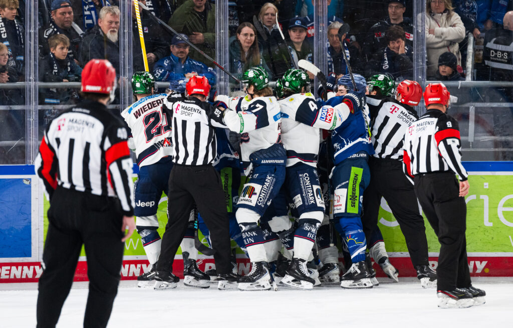 Danach wurden die ersten „Nettigkeiten“ ausgetauscht und zwischen Yannick Veilleux und Adrian Klein gab es den ersten Fight in dieser Serie zu sehen. So heizte man die Atmosphäre in Straubing nur noch mehr auf, womit man sich auch keinen Gefallen getan hat.
