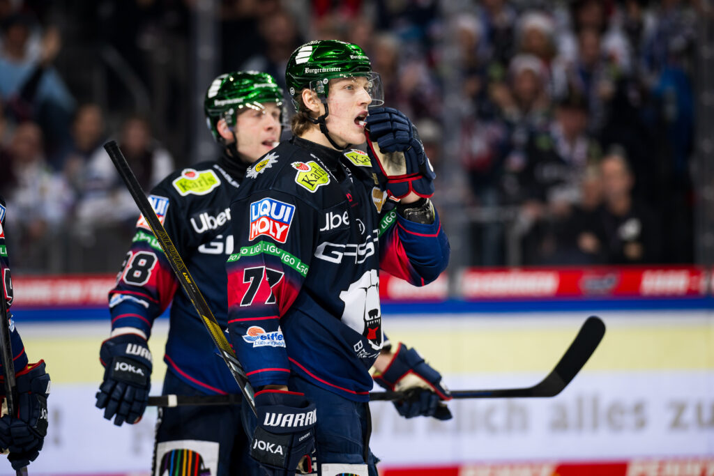 Der Start verlief jedenfalls nach Maß. Keine drei Minuten waren gespielt, da hatte Eric Hördler Janne Juvonen zum ersten Mal an diesem Abend überwunden und damit sein erstes Saisontor erzielt – 1:0. Da hatte sich die Nummer 77 endlich belohnen können, denn Chancen hatte er sich in den 29 Spielen zuvor schon genügend erarbeitet. Glückwunsch, Eric!