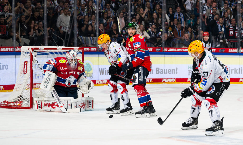 Kaum schreibe ich das, arbeiteten die Eisbären die Scheibe ins Tor und bezwangen endlich Julius Hudacek. Rückkehrer Blaine Byron hatte die Scheibe am Ende über die Linie gedrückt – 1:3 (37.). Liam Kirk war klasse mit der Scheibe hinters Tor gefahren und brachte sie dann gefährlich vor das Tor, wo Byron zur Stelle war.